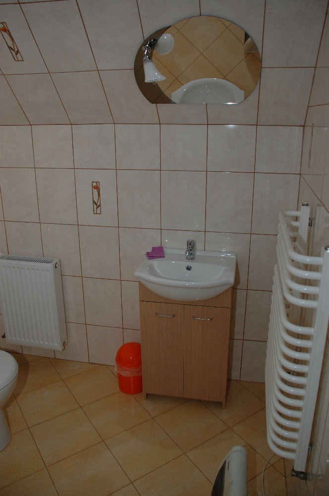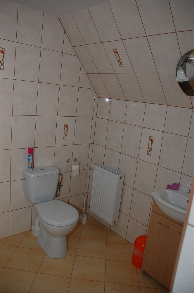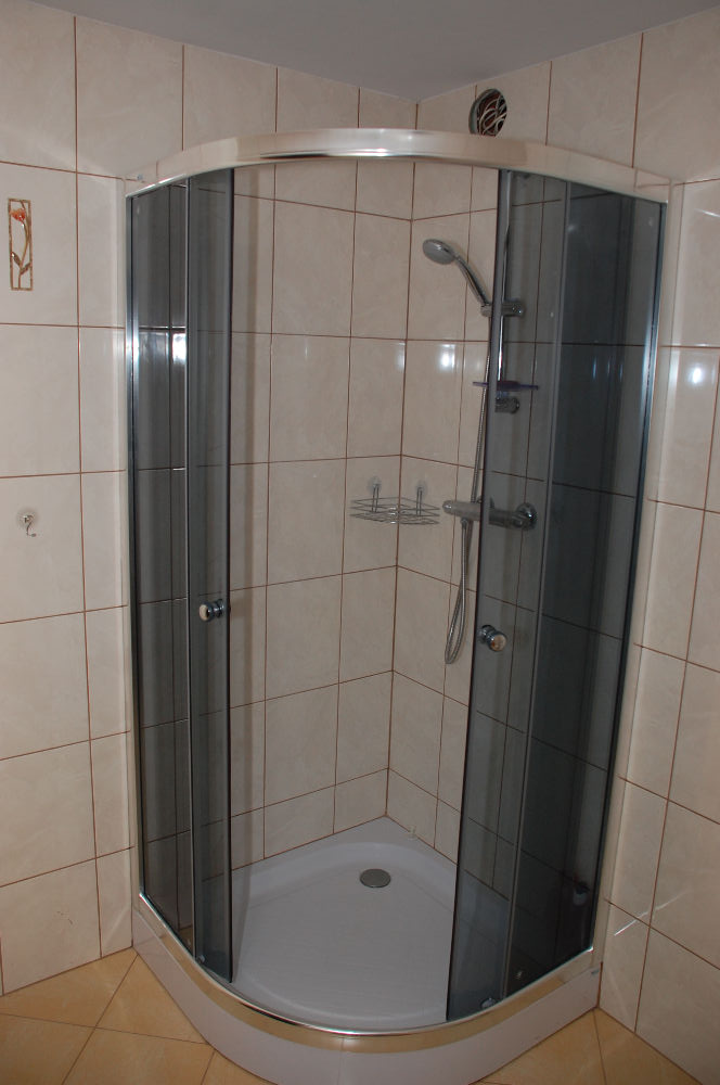 Kabina prysznicowa, w.c., umywalka, szafka pod umywalką, suszarka do włosów, suszarka na ręczniki.